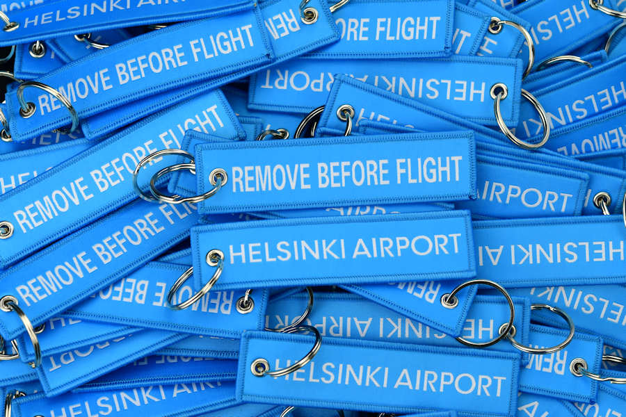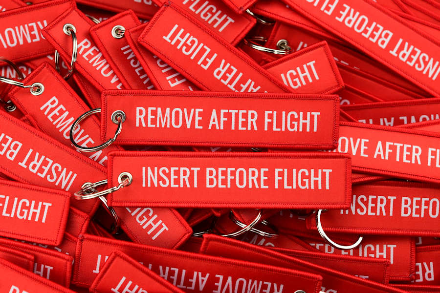 Erittäin suosittu avaimenperänä, Remove Before Flight kangasmerkit juontavat juurensa ilmailun parista jossa näillä merkeillä merkitään osia tai komponentteja jotka tulee irrottaa ennen lentoon lähtöä. Remove Before Flight tagit ovat suosittuja avaimenperinä yrityksen omalla logolla, usein myös yksilöllisellä tekstillä perinteikkään "Remove Before Flight" -tekstin sijaan.